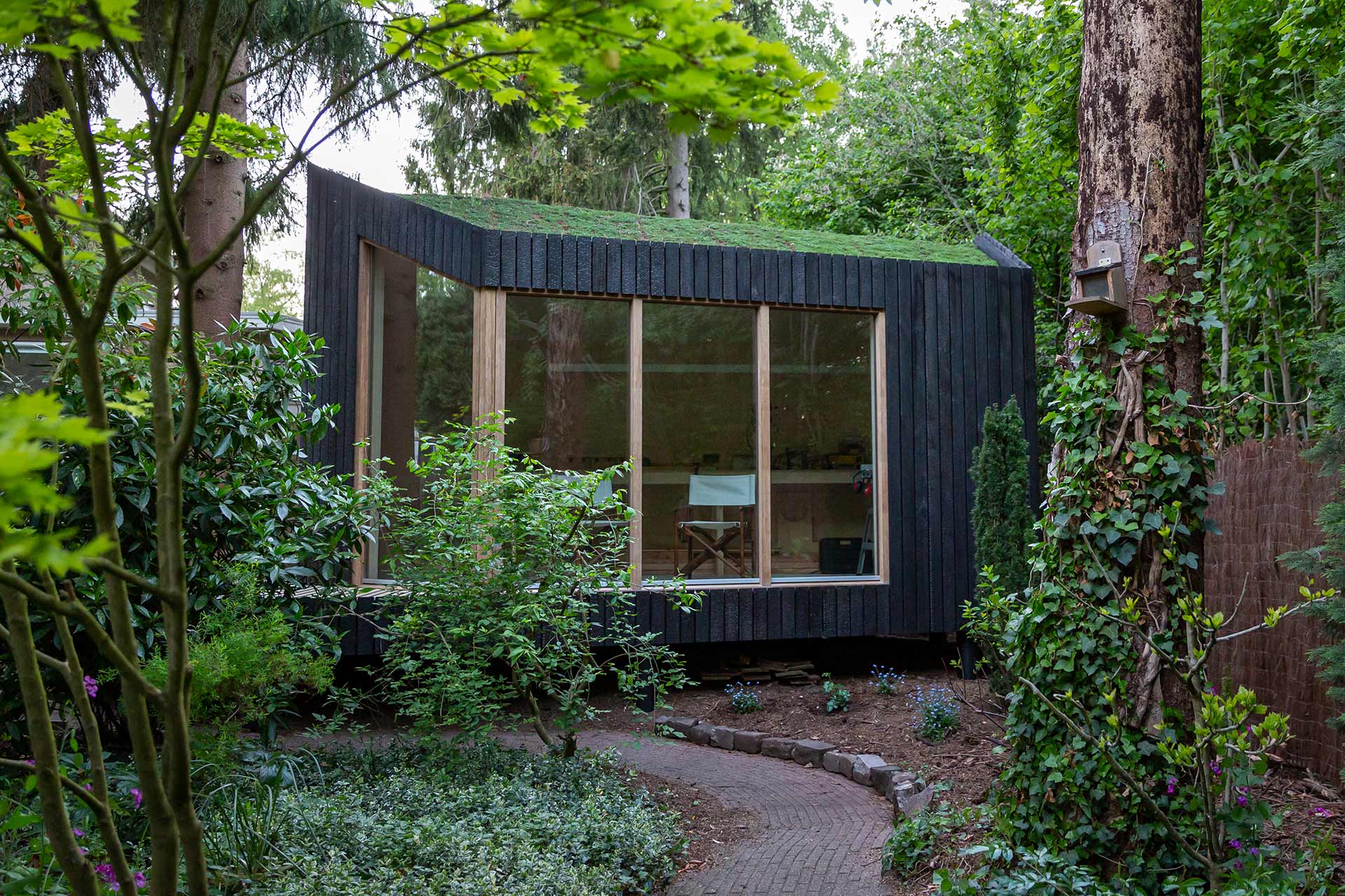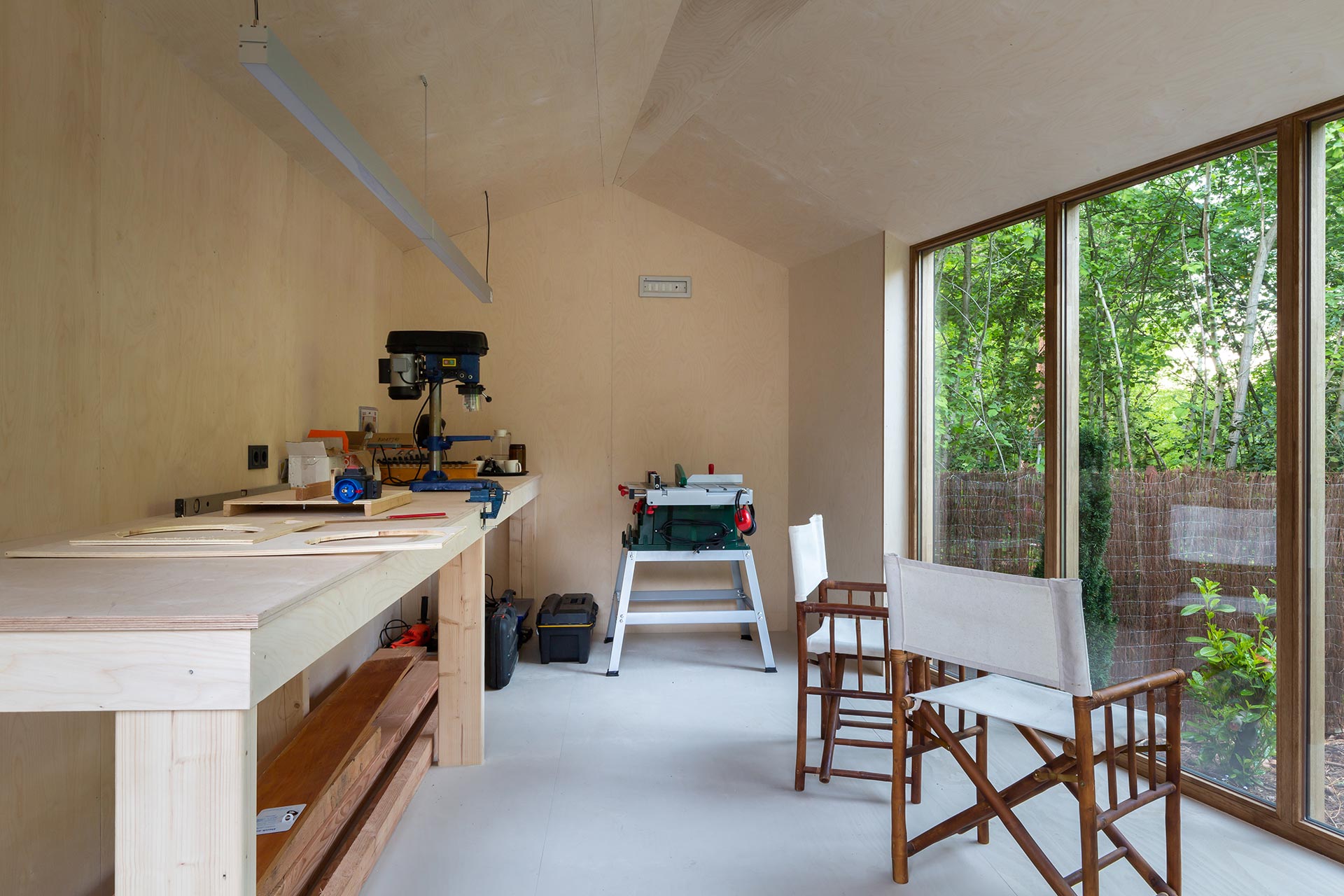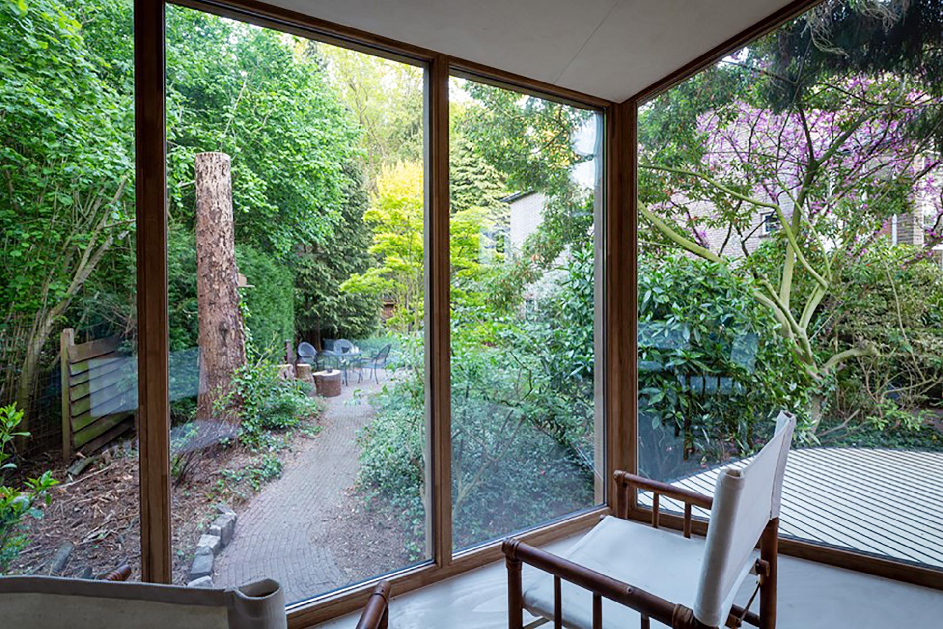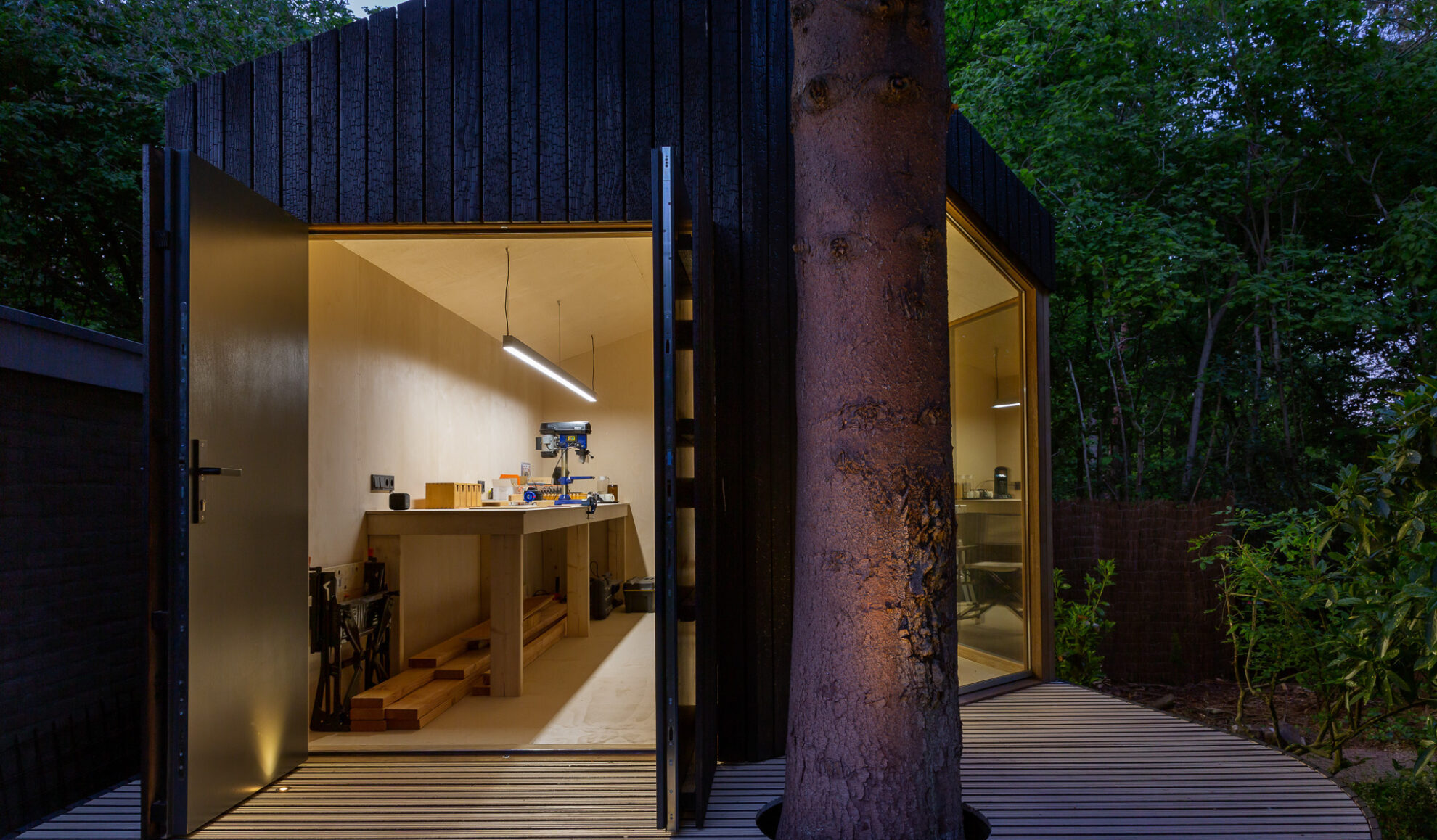 Dans un jardin arboré a été réalisée une compacte menuiserie/maison de jardin. Des matériaux naturels, durables et nécessitant peu d’entretien ont été utilisés, notamment des châssis en Platowood Fraké. La relation avec le jardin a constitué un point de départ essentiel pour la conception, réalisée par Strategie Architecten. Le pavillon a littéralement été construit autour d’un arbre et surélevé par rapport au sol afin de ne pas gêner la croissance de celui-ci.