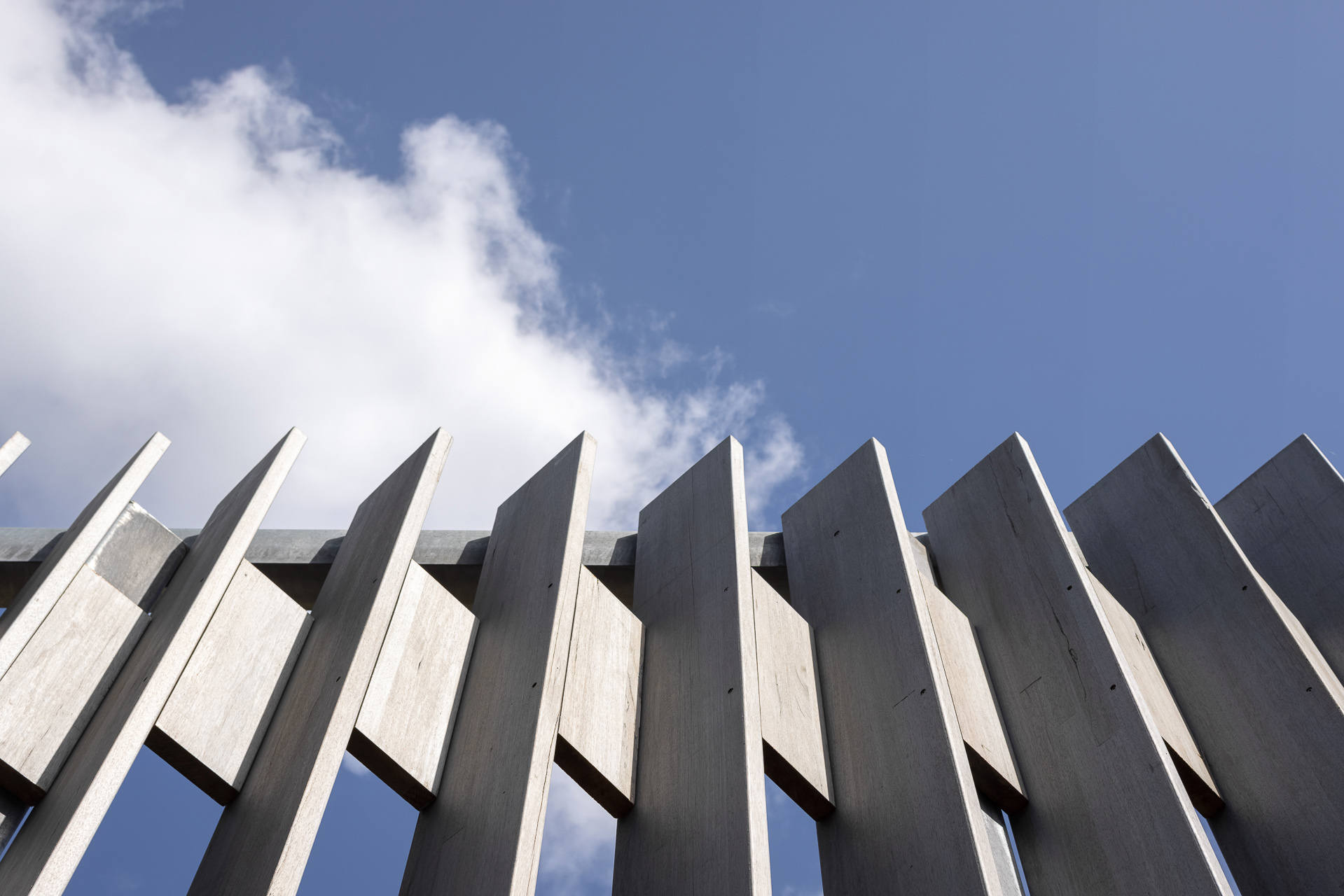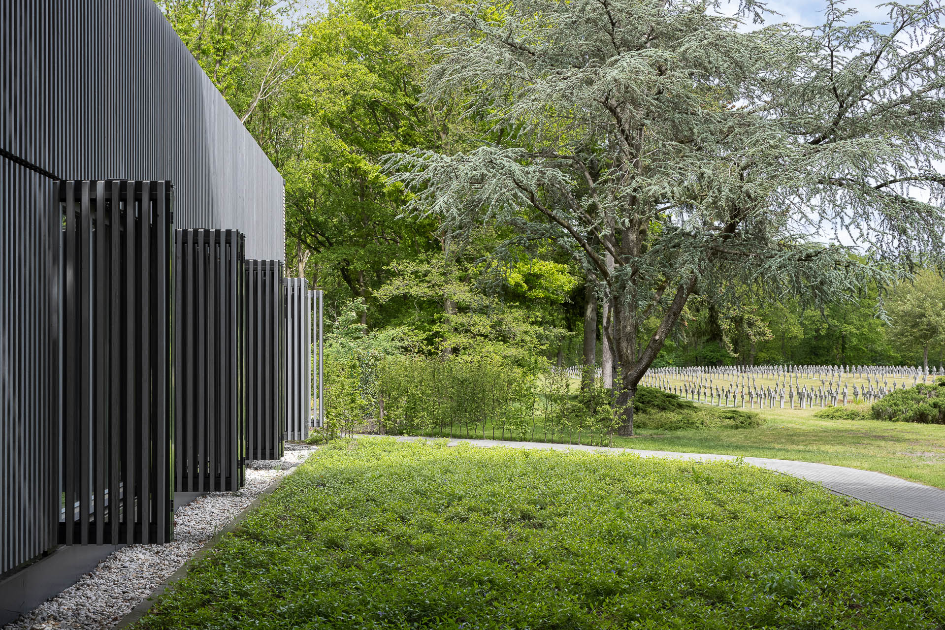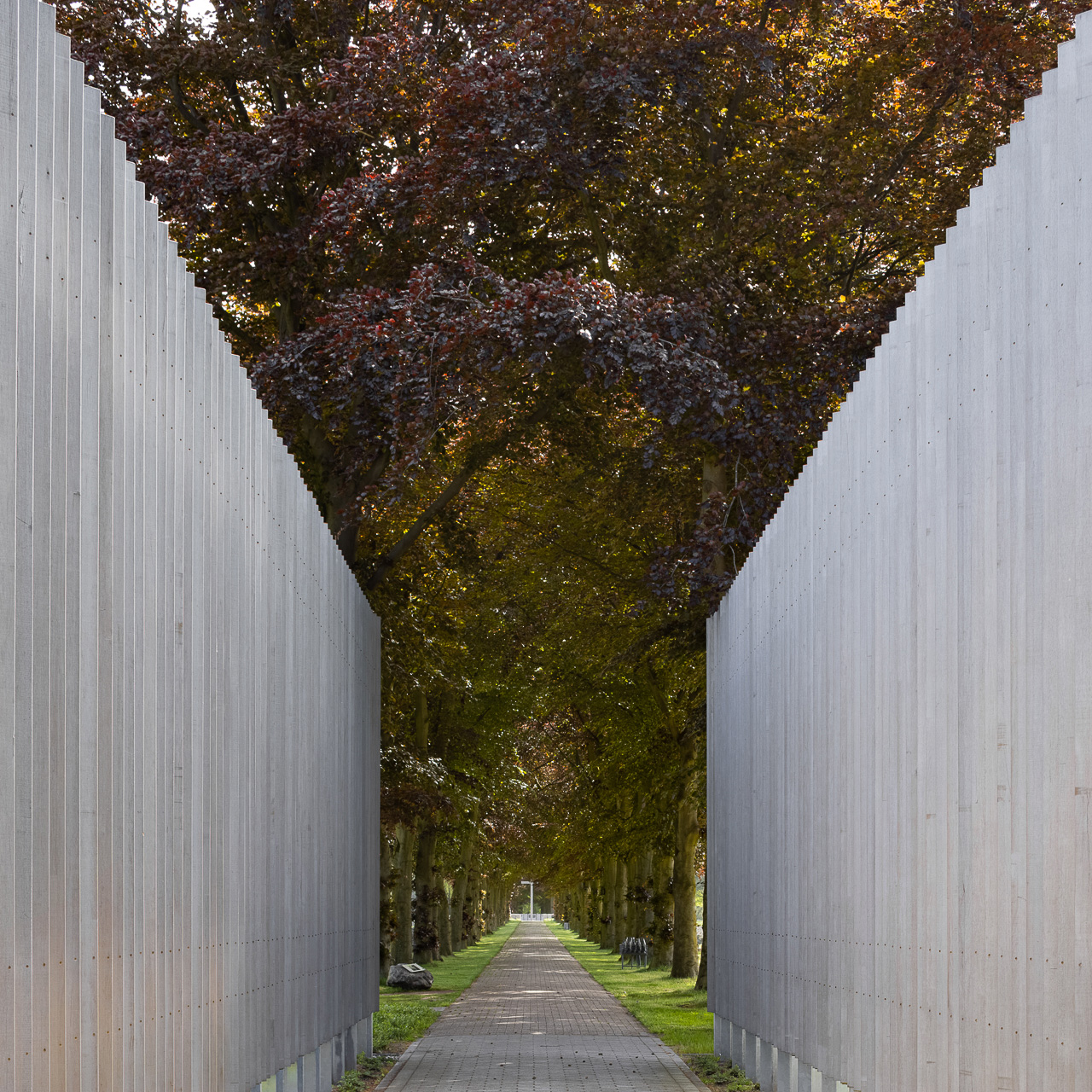 Le parcours du visiteur depuis le parking jusqu’au centre d’accueil est divisé en trois parties. D’abord, une longue allée est formée par des lamelles décoratives en Platowood. Par leur orientation, elles sont perçues comme un passage fermé à l’aller. Ce couloir construit en quelque sorte la tension : où vais-je, que puis-je attendre ? Le rétrécissement suivi du débouché renforce la confrontation avec les 32 000 croix et l’ampleur du site. Les récits liés aux tombes forment le dénouement.