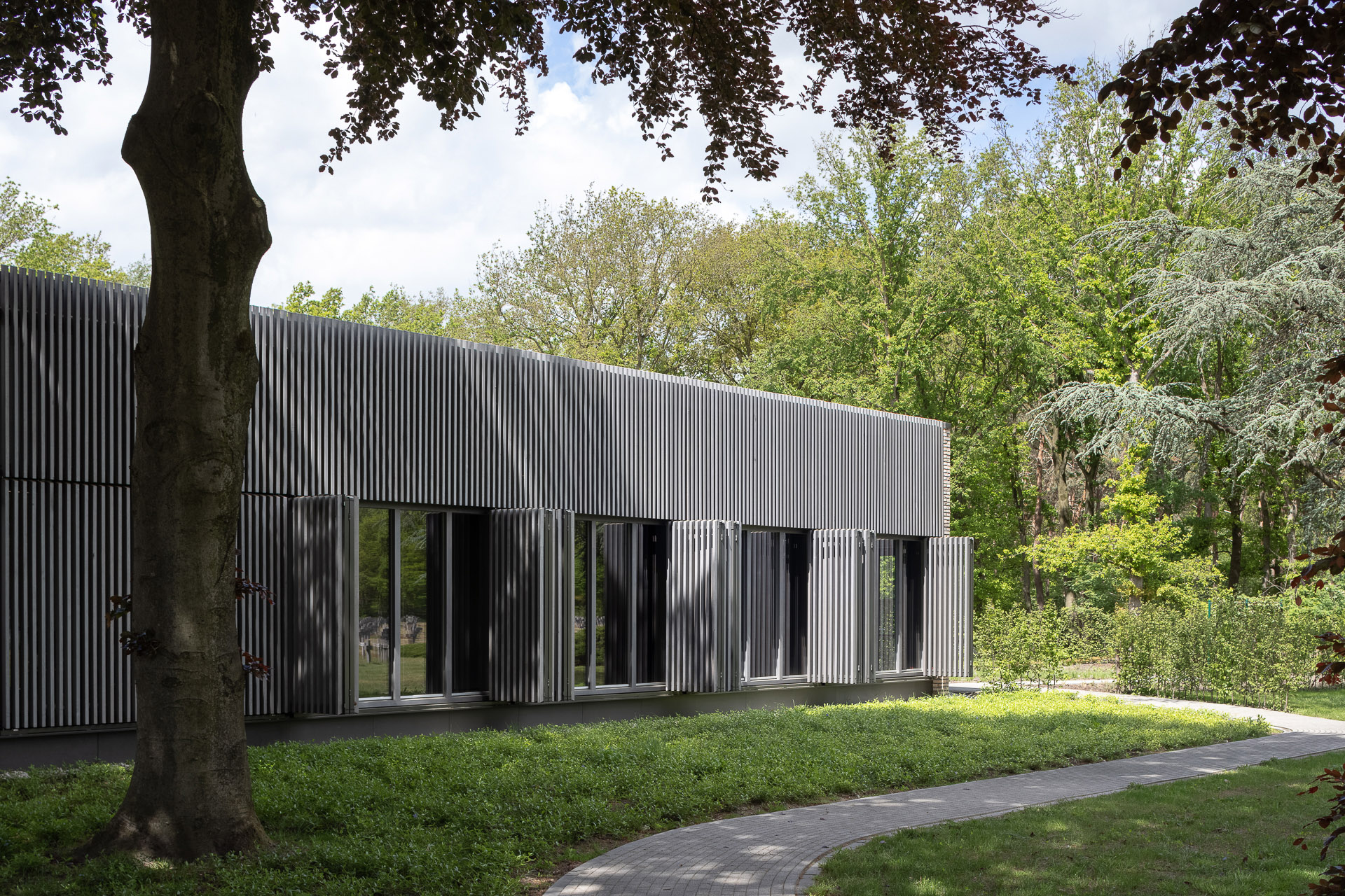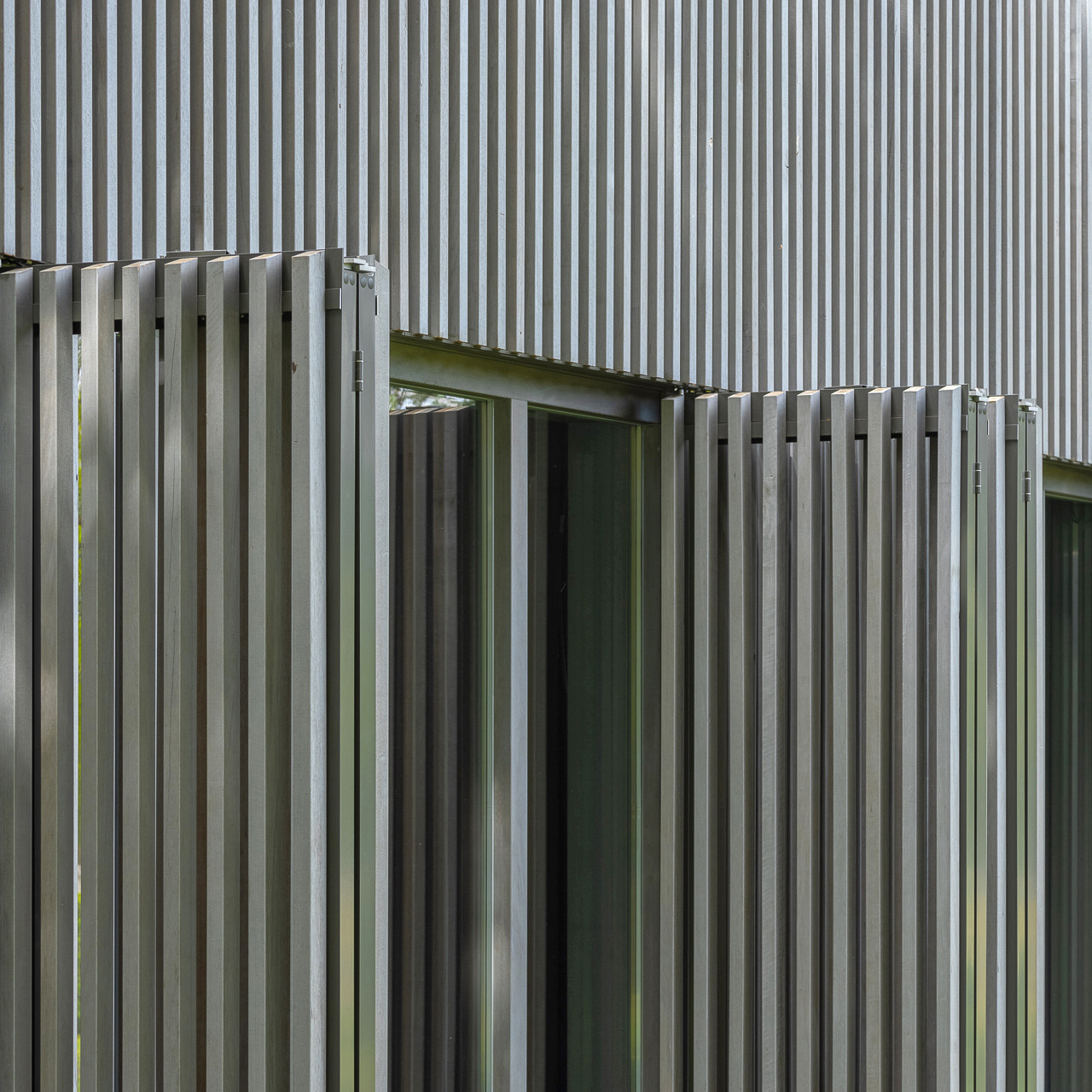 En plus des lamelles décoratives, les volets pare-soleil du côté du cimetière attirent l’attention. Lorsqu’ils sont fermés, le bâtiment forme de ce côté un décor sobre pour le site. Depuis l’intérieur, le visiteur garde toutefois une vue sur le cimetière à travers les lattes. Il existe ainsi toujours un lien visuel, sans jamais exposer directement le lieu à la vue. En ouvrant ou fermant les volets, on peut choisir la quantité de lumière du jour et la vue sur le cimetière.