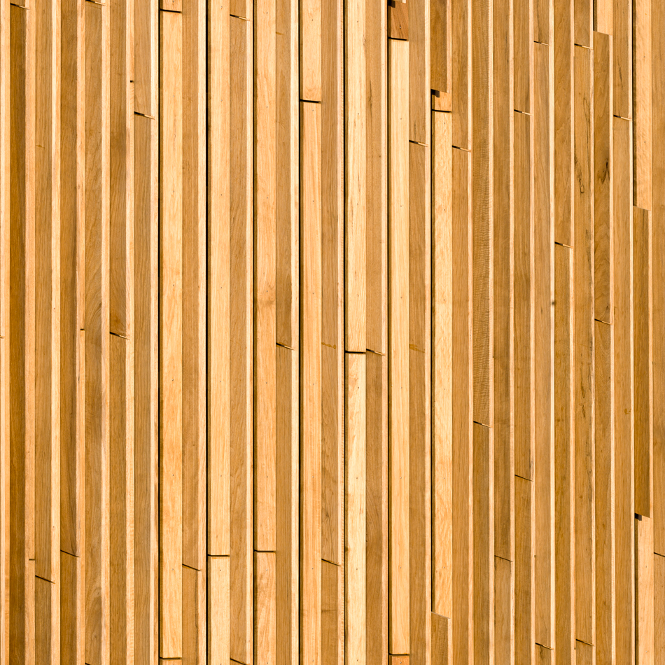 Les lettres du logo apparaissent de manière subtile dans la façade. Selon l’endroit où l’on se tient, le moment de la journée et l’incidence de la lumière, un jeu d’ombres se crée sur les planches transversales. La façade, et donc l’apparence du bâtiment, change au fil de la journée.