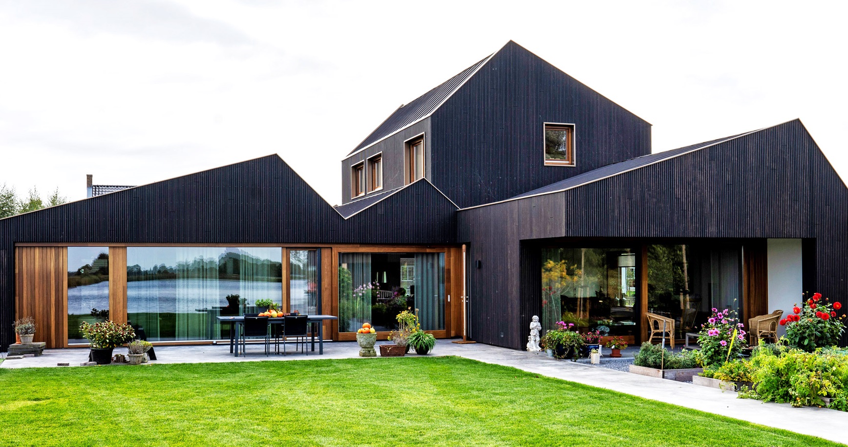 Côté eau, la façade est ouverte ; côté rue, elle est fermée pour des raisons d’intimité et de bruit de circulation. Pour le bardage, les architectes ont choisi le Platowood Fraké avec notre finition sombre Burned. Une référence subtile à la tourbe autrefois utilisée comme combustible.